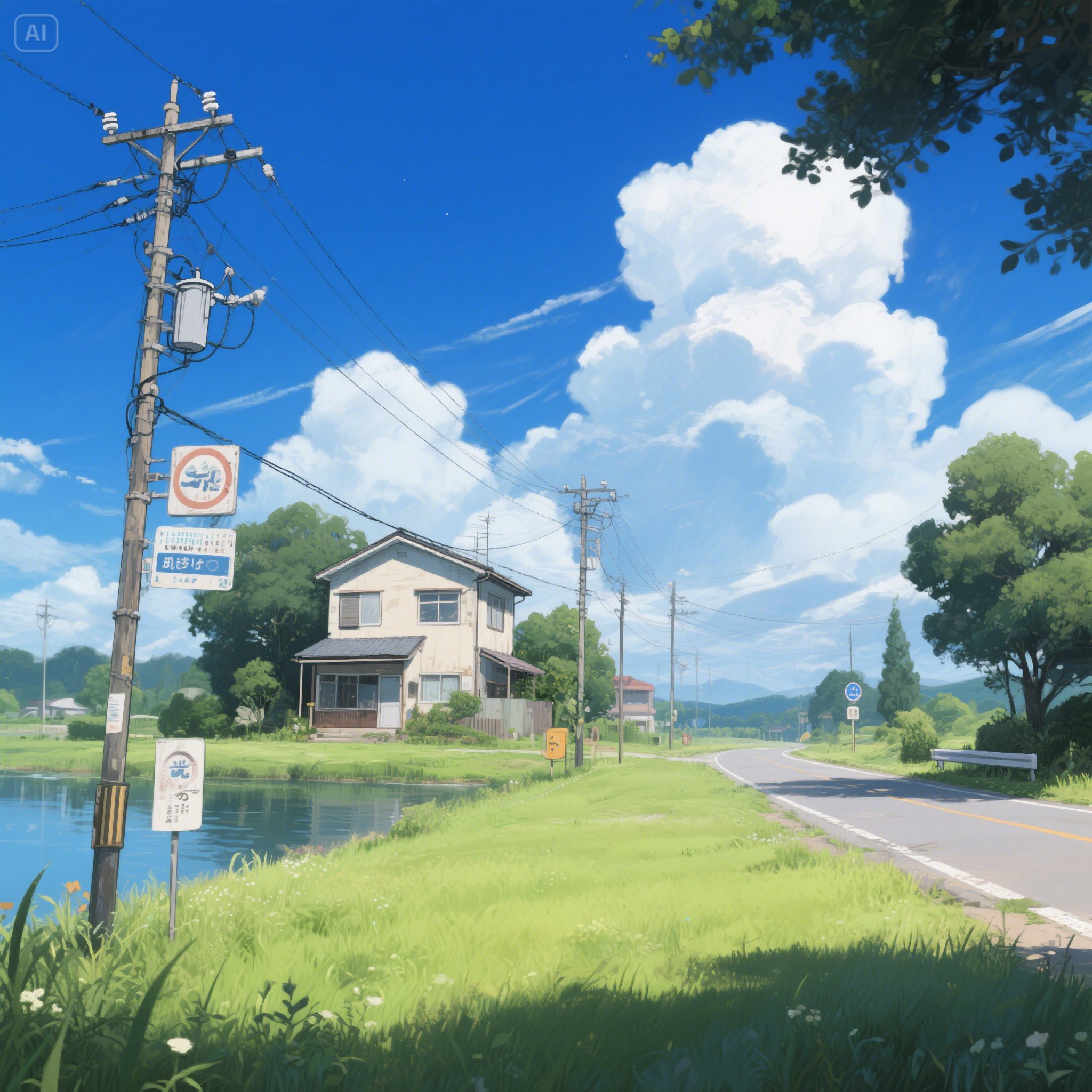 outdoors,no humans,house,cloud,grass,sky,day,power lines,scenery,road,tree,traditional media,utility pole,sign,blue sky,building,cloudy sky,water,masterpiece,best quality,Negative prompt: FastNegativeV2,(bad-artist:1),(worst quality, low quality:1.4),(bad_prompt_version2:0.8),bad-hands-5,lowres,bad anatomy,bad hands,((text)),(watermark),error,missing fingers,extra digit,fewer digits,cropped,worst quality,low quality,normal quality,((username)),blurry,(extra limbs),bad-artist-anime,badhandv4,EasyNegative,ng_deepnegative_v1_75t,verybadimagenegative_v1.3,BadDream,(three hands:1.6),(three legs:1.2),(more than two hands:1.4),(more than two legs,:1.2),label,Steps: 30, Sampler: DPM++ SDE Karras, CFG scale: 7, Seed: 686389491, Size: 540×960, Model hash: 4a81859920,